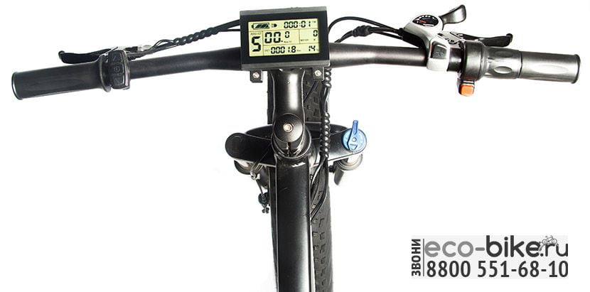 На руле установлены LCD-дисплей и три кнопки. Это устройство предназначено для включения/выключения электровелосипеда, отображения скорости, мощности, пробега, уровня заряда АКБ, а также для настройки контроллера. По сути это бортовой компьютер со множеством функций. Есть регулируемая подсветка экрана и защита от дождя.
